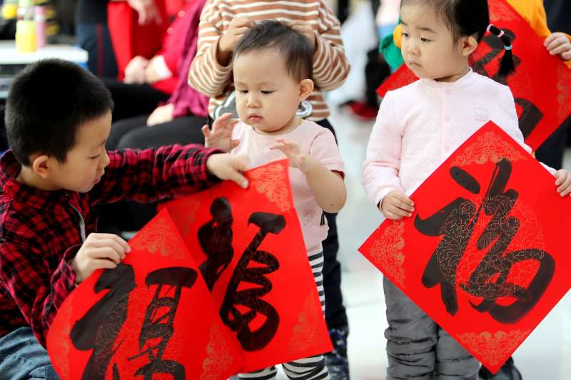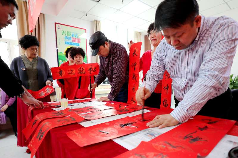 在鮮艷的紅紙上,火紅的對聯(lián)寄托了居民辭舊迎新、接福納祥的美好愿望。紅紅火火的春聯(lián)飽含祝福,洋溢著濃濃的喜慶氛圍。